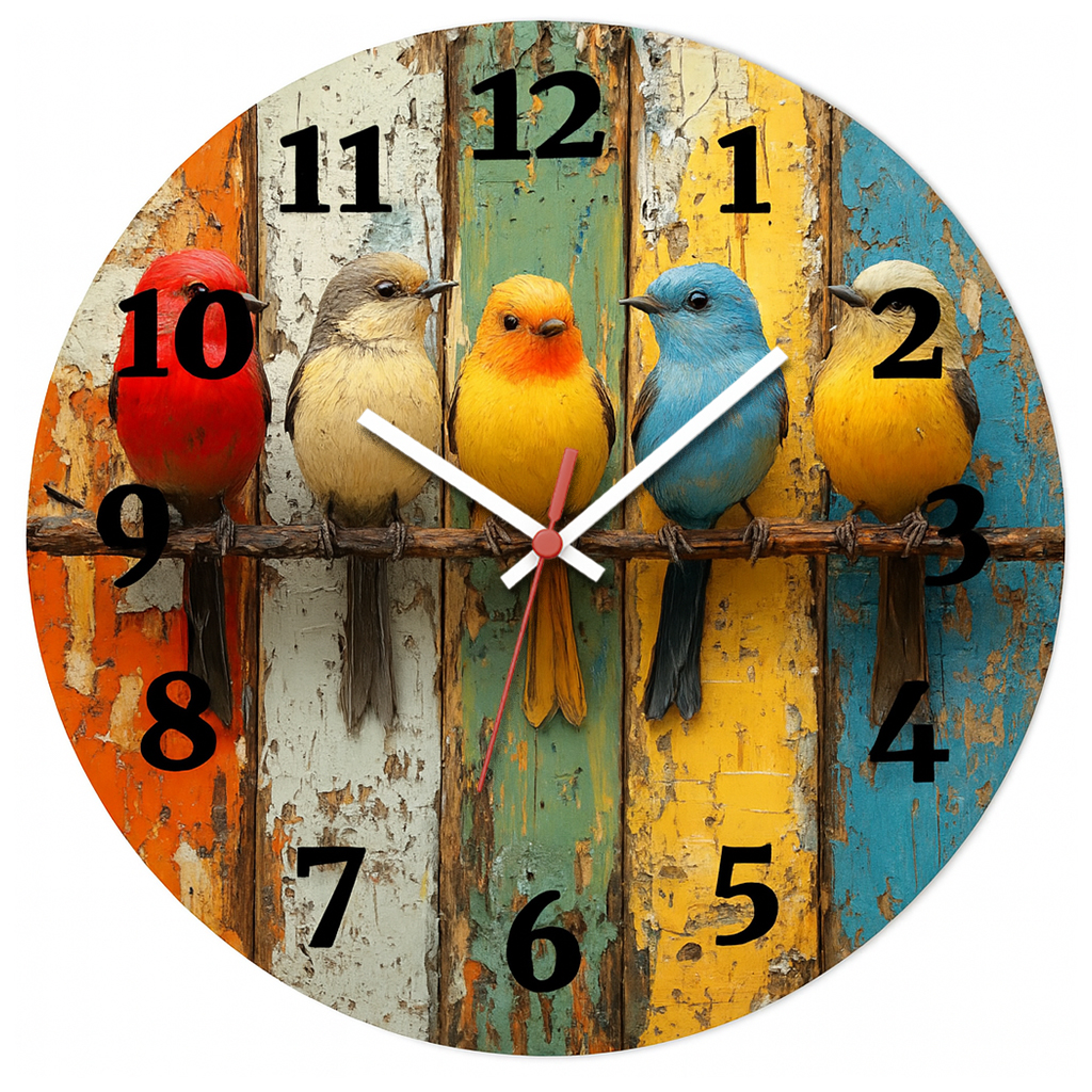 Relógio de Parede Pássaros Coloridos na Madeira – Estilo Rústico Vintage