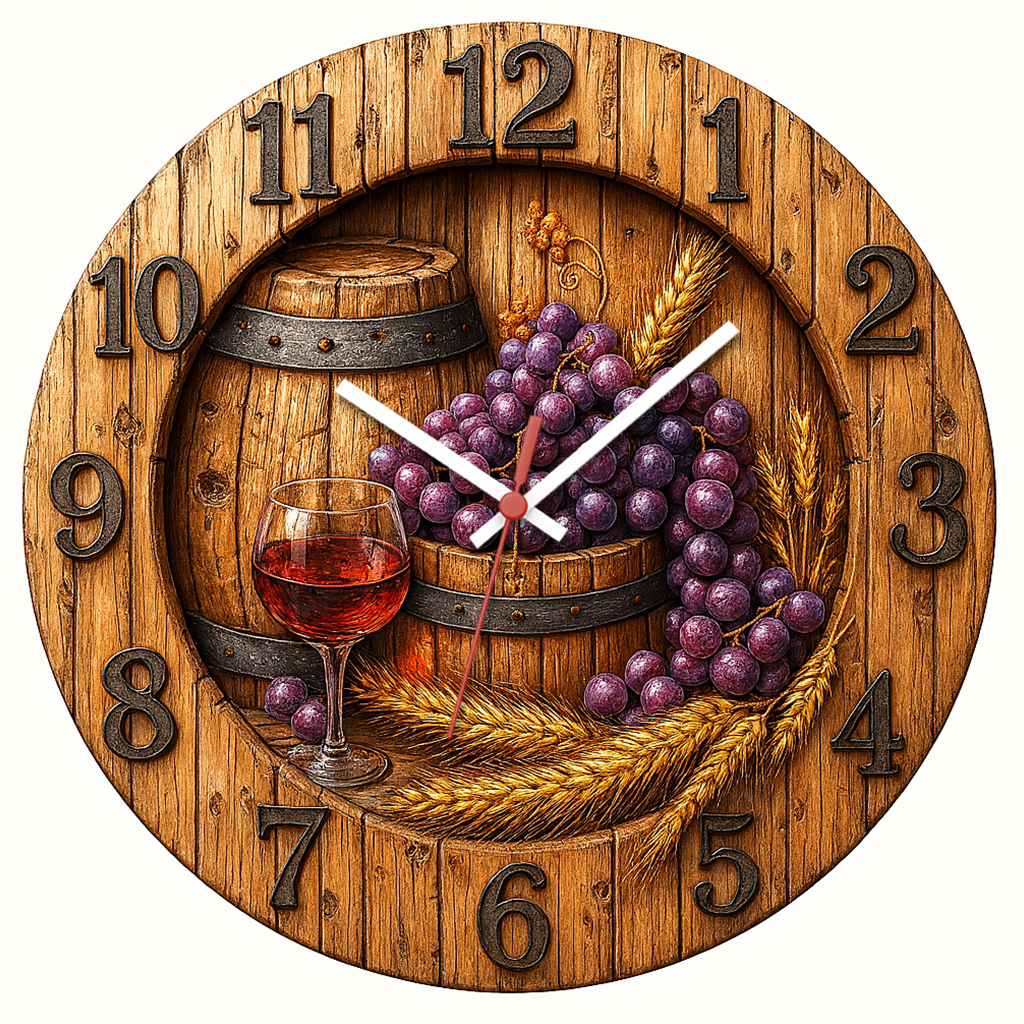 Relógio com dois barris em cenário rústico, perfeito para compor decorações temáticas de vinho.