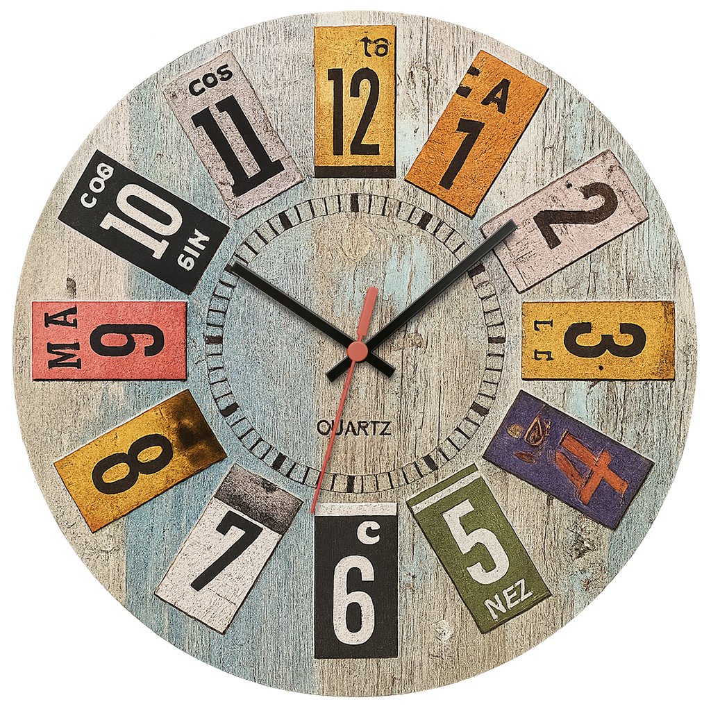 Relógio de parede com design criativo em estilo colagem vintage, apresentando números coloridos em placas inspiradas em tipografia retrô. Com fundo em textura de madeira envelhecida, ele adiciona personalidade e um toque artístico a salas, cozinhas, escritórios e ambientes descontraídos. Produzido em MDF com impressão adesivada de alta definição, é uma peça moderna e divertida que une decoração e funcionalidade.