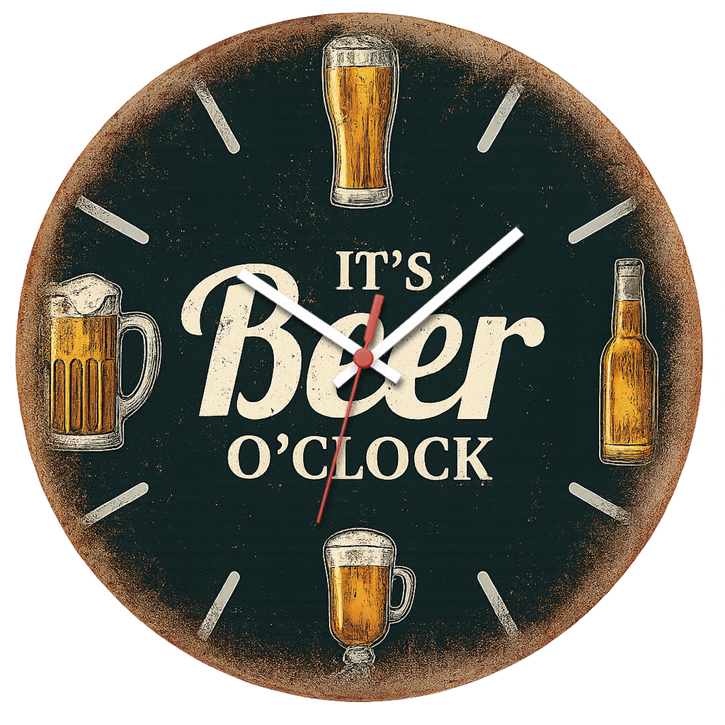 Com fundo envelhecido e estilo rústico, este relógio traz copos e garrafas de cerveja para dar o clima perfeito ao seu boteco ou churrasqueira.