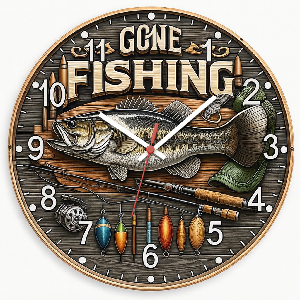 Relógio com design “Gone Fishing” e detalhes de pesca, ideal para decorar áreas gourmet, churrasqueiras e espaços de pescadores apaixonados.
