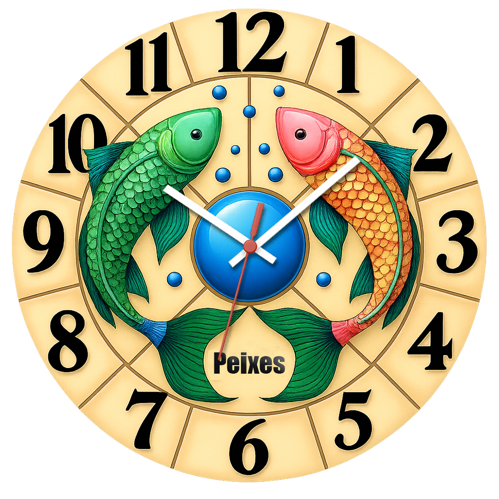 Peixes sente o mundo de um jeito mágico. Este relógio traduz sensibilidade, intuição e poesia no tempo. Suave, artístico e profundo, ele reflete a alma de quem vive entre realidade e fantasia. O tempo pisciano é mar, imaginação e coração aberto.