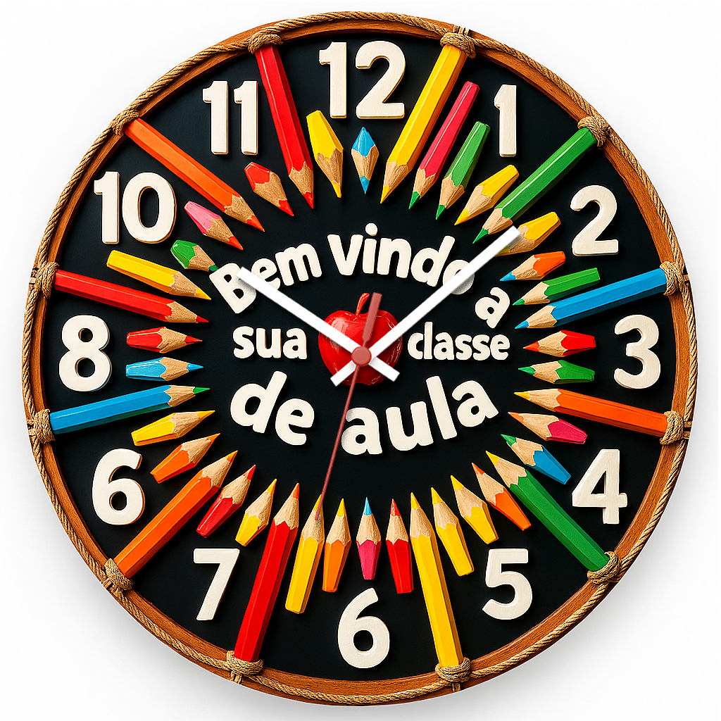 Relógio decorativo com lápis coloridos e mensagem de boas-vindas, perfeito para salas de aula e ambientes escolares.