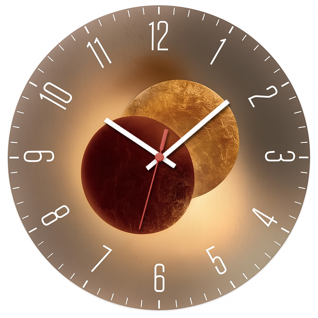 Relógio de parede com design moderno em tons de dourado e marrom, destacando duas esferas em contraste que criam um efeito artístico elegante. Ideal para salas, escritórios e ambientes sofisticados. Produzido em MDF com impressão adesivada de alta definição.