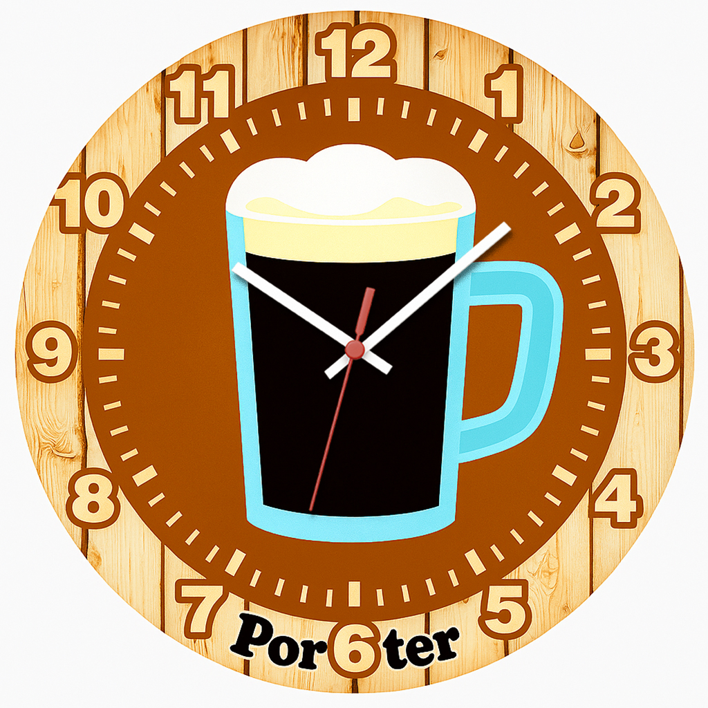 Relógio com arte divertida estilo cartoon e fundo em madeira clara. A caneca preta representa a cerveja Porter. Perfeito para decorações criativas e informais.