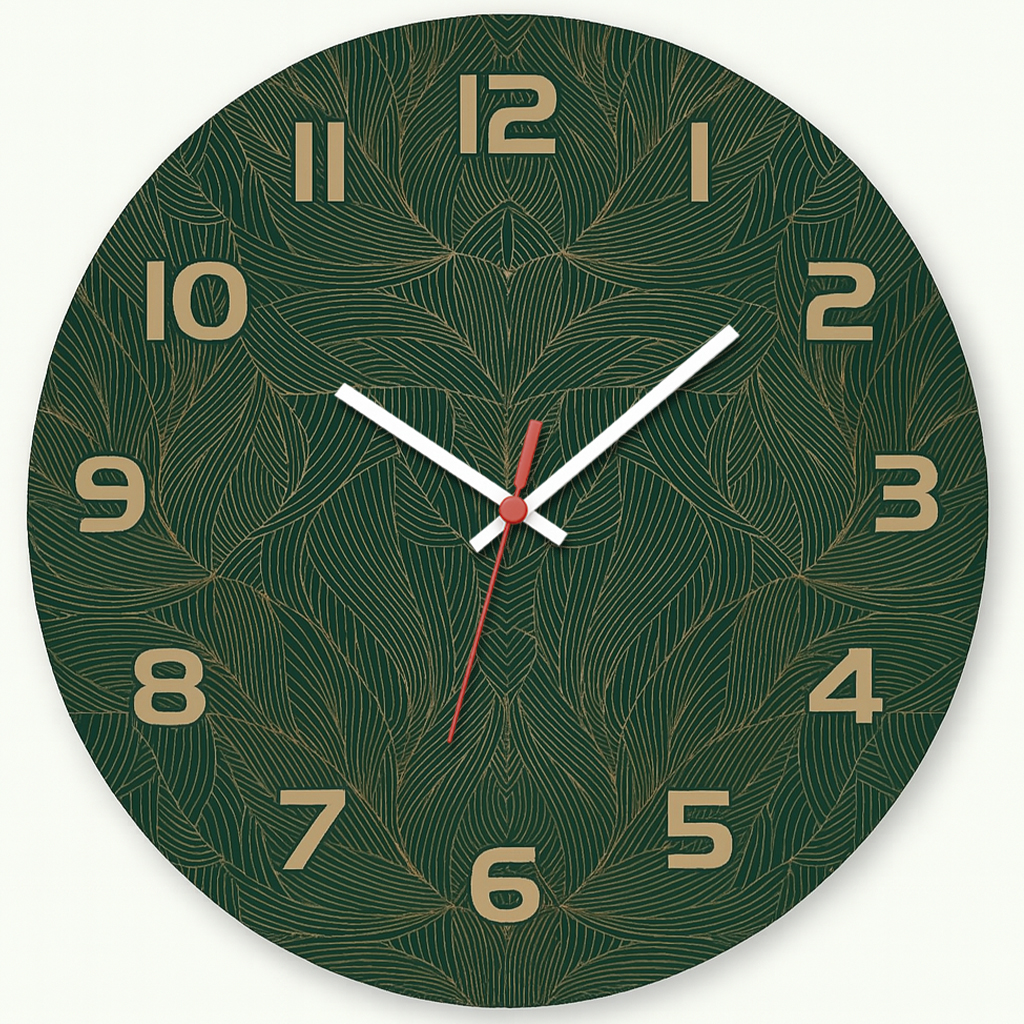 Relógio de parede com design botânico moderno em tons de verde e dourado, inspirado em formas naturais e elegantes. Ideal para salas, varandas, escritórios e ambientes com decoração sofisticada. Produzido em MDF com impressão adesivada de alta definição, une arte e funcionalidade.