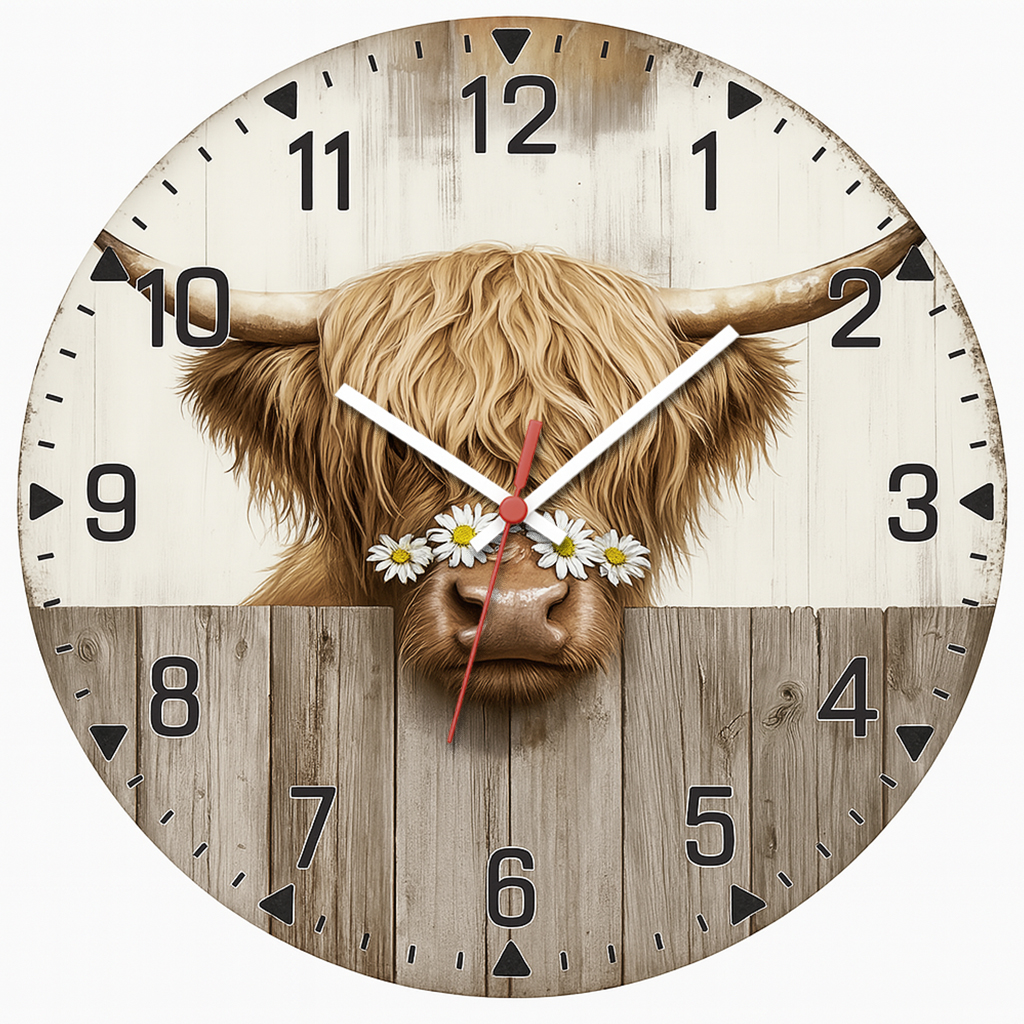 Relógio de Parede Boi Highland com Margaridas – Estilo Country