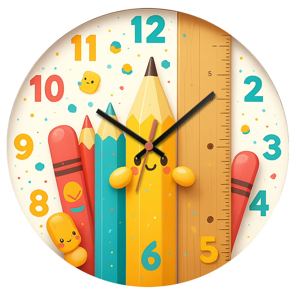 Relógio divertido com lápis e régua em estilo lúdico, perfeito para salas de aula, creches e espaços de aprendizagem.