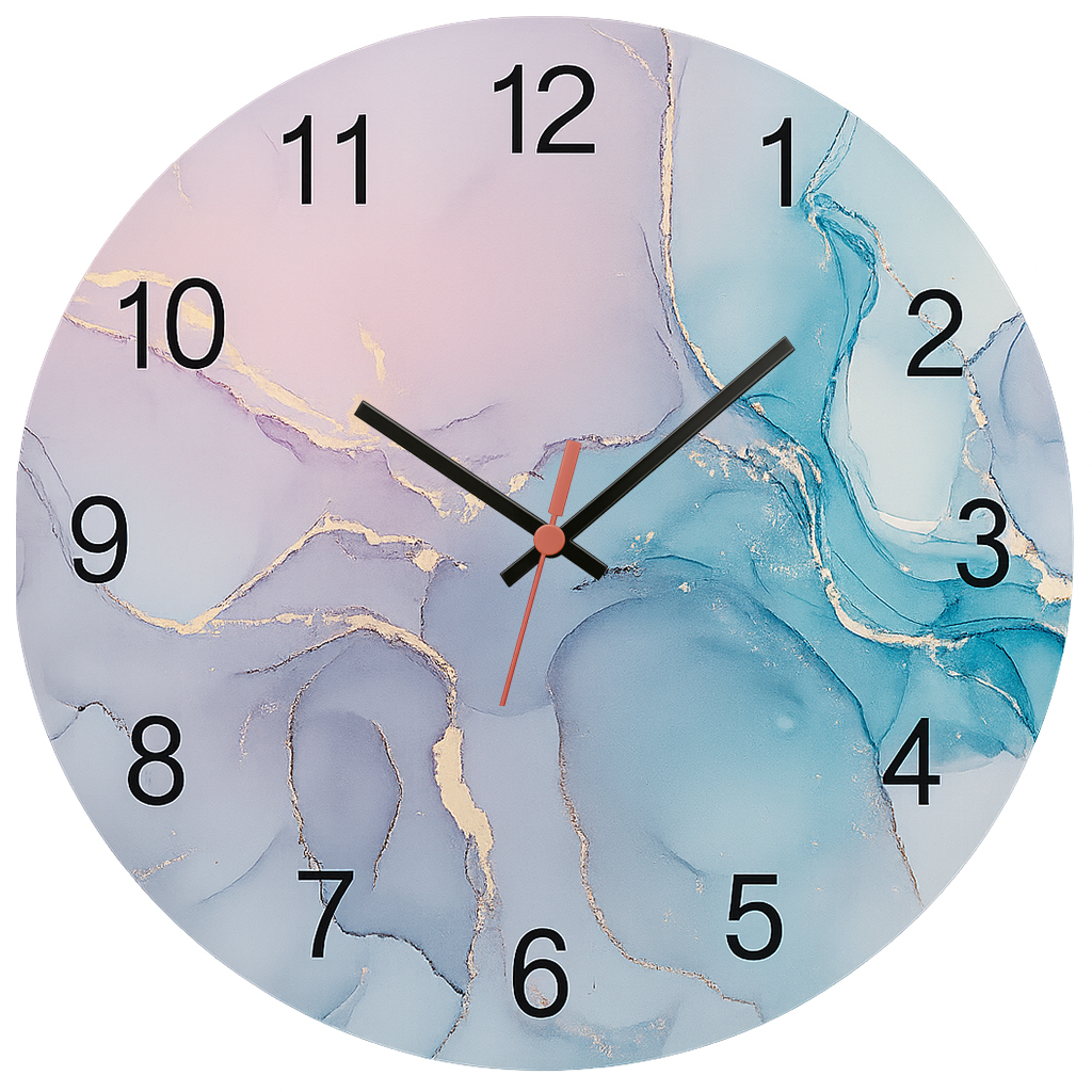 Relógio de parede com arte fluida em tons de azul e lilás, lembrando o efeito de mármore delicado. Ideal para quem busca uma decoração moderna e leve em salas, quartos ou escritórios. Produzido em MDF com impressão adesivada de alta definição, une sofisticação e funcionalidade.