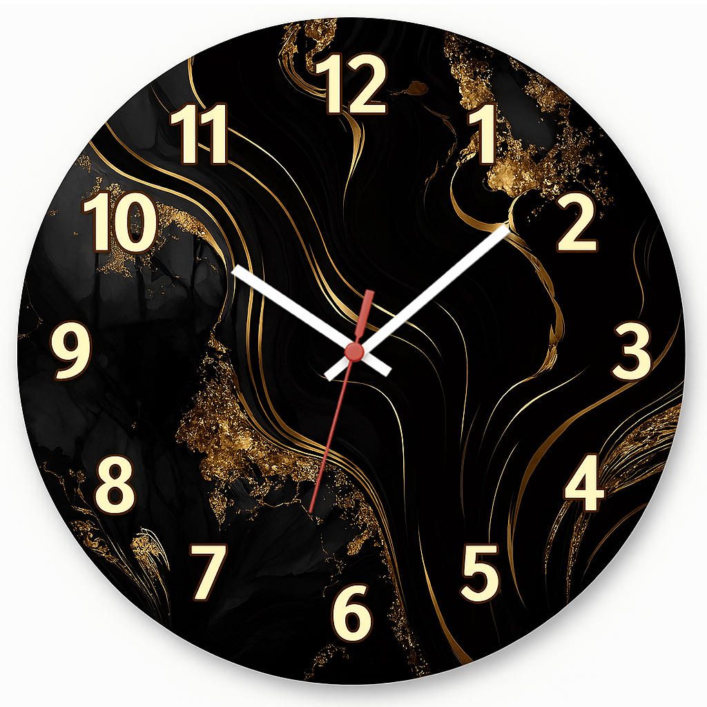 Esse relógio possui um visual sofisticado e impactante, com fundo preto profundo e detalhes em veios dourados fluidos, lembrando mármore nobre com acabamento de luxo. Um modelo perfeito para ambientes modernos, glamourosos ou com decoração preta e dourada.