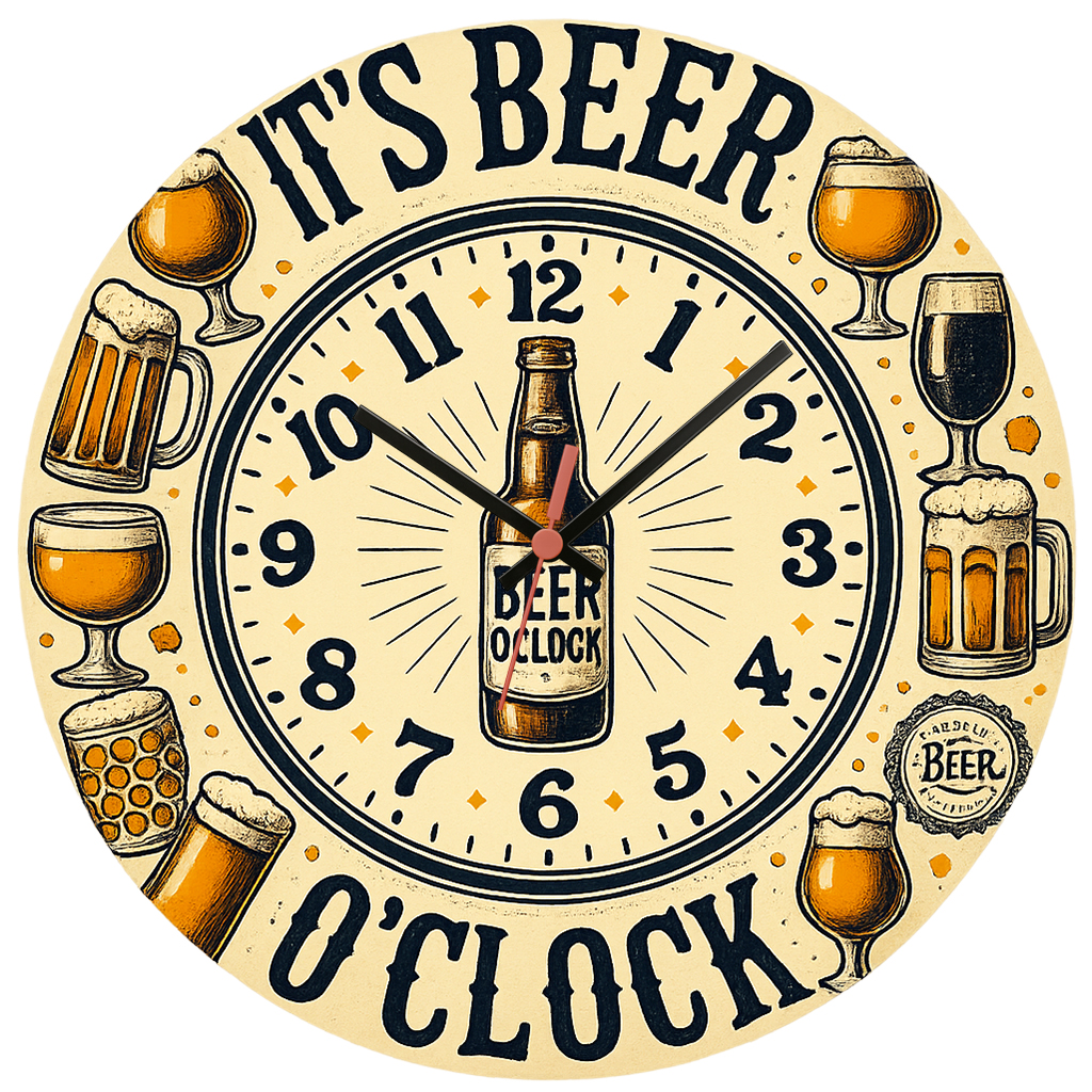 Relógio de parede com a frase “It’s Beer O’Clock” e ilustrações de canecas e copos de cerveja em estilo retrô. Ideal para decorar bares, botecos, churrasqueiras ou espaços gourmet. Produzido em MDF com 28 cm de diâmetro, corte a laser e impressão adesivada. Um toque descontraído e criativo para o seu ambiente!