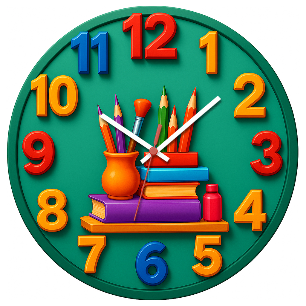 Relógio decorativo com livros e lápis em design vibrante, ideal para bibliotecas, salas de leitura e ambientes escolares criativos.