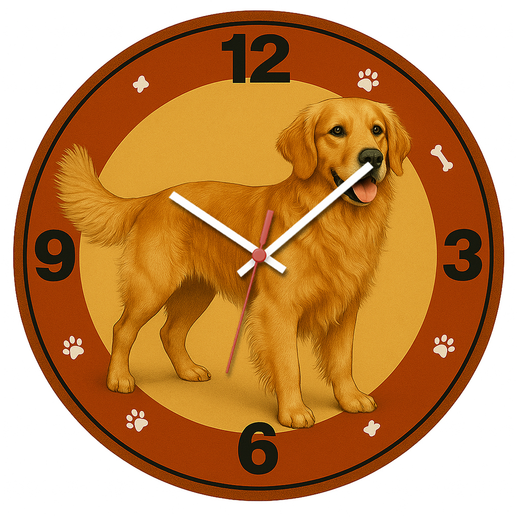 Relógio de parede com imagem realista do simpático e fiel Golden Retriever. Um toque de ternura e alegria para quem ama essa raça. Produzido em MDF com 28 cm de diâmetro, corte a laser e impressão adesivada.
